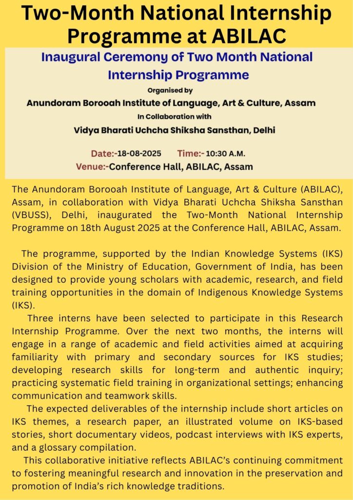 The Anundoram Borooah Institute of Language, Art and Culture (ABILAC), Assam, successfully concluded its 120-hour Internship Programme on 7th August 2025. The programme, which commenced on 15th July 2025, provided a unique opportunity for undergraduate students to gain hands-on experience in areas such as language and linguistics, cultural tourism, dictionary making, and library management.